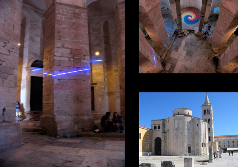Installation alludes to a scanning through the layers of a space-time continuum of that particular object (Church of St. Donat , Zadar/ Antique Roman Temple, Christian medieval Church, Venetian warehouse, todays Museum/Gallery/Concert Hall).