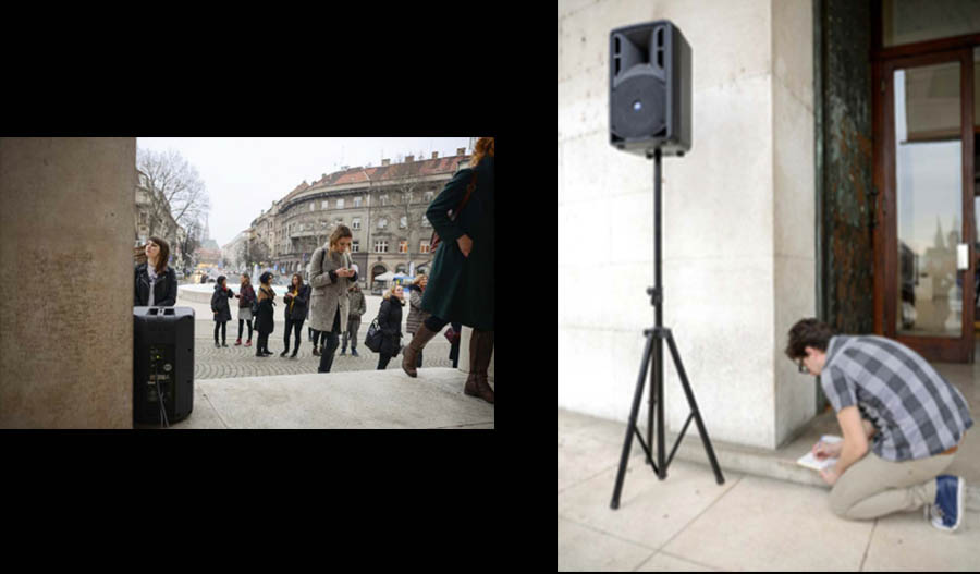 LAUGHING BUTTERFLIES (2015) is sound installation of the sounds of laughter without a visible source that brings astonishment into the urban environment. By abstracting a laughter to its primal and archetypal, and underlining its ambivalence, this sound installation also reflects on historical physical and symbolic interventions onto that particular building. (Home of Croatian Artists, The Mosque, Museum of Revolution, Croatian Association of Artists)