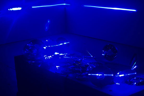 LOGOS (2009) installation shows different patterns that light creates on the surrounding surfaces are the product of the vibration of sound and diffraction of light. The interaction of ambient sounds produced by visitors, blue lasers, CDs, AC motors and Arduino are creating ever new light forms.